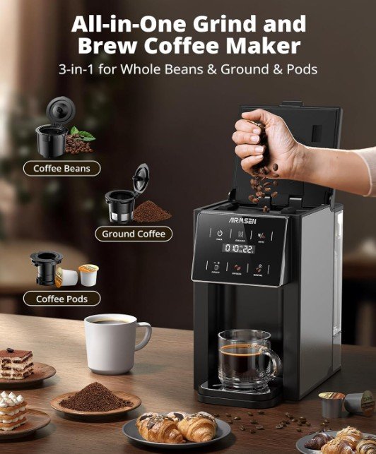 The Airmsen Grind and Brew Coffee Maker review presents a compact 3-in-1 machine designed to bring café-level taste straight to your countertop. Made by the American brand Airmsen, this model grinds, brews, and adapts to your preference using whole beans, ground coffee, or K-Cup pods. It delivers a fresh, full-bodied cup in just 1.5 minutes, combining authentic flavor with everyday convenience. Its precise touchscreen, five grind levels, and five brewing sizes give you full control over strength and taste. Ideal for home or office use, it blends sleek design with professional features. You can view the Airmsen Grind and Brew Coffee Maker directly on Amazon.ca for more details and current availability.